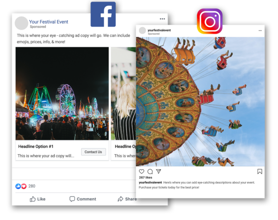 Utilizing Facebook’s advertising platform, we can tap into many different audiences of people on Facebook and Instagram. Social Media advertising has the unique ability to not only target the right Festival customer in the area of your choice, but it also allows social interaction between a customer and the Festival Event. People can comment, like, and share your post with other friends and family. Facebook also has the ability to use video and image ads to engage potential customers. Your customers are Facebook and Instagram, and we’ll use these platforms to reach them directly with your messaging.